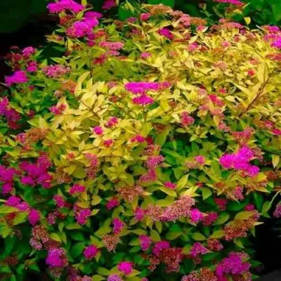 Кустарник ежегодно увеличивается примерно на 5–10 см в высоту и на 10–15 см в ширину, формируя плотную декоративную форму. Цветки розовато-красного оттенка собраны в щитковидные соцветия диаметром около 3–4 см и сохраняют выразительность на протяжении всего периода цветения. Сорт хорошо переносит климатические условия большинства регионов России, устойчив к вредителям и болезням, а также не требует сложного ухода.